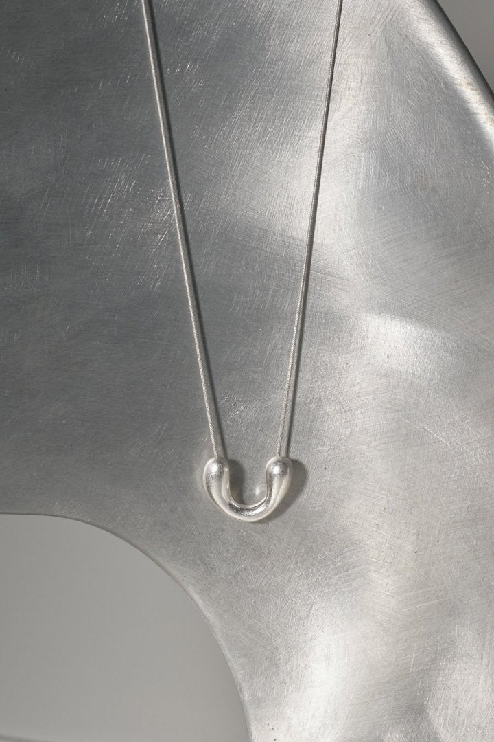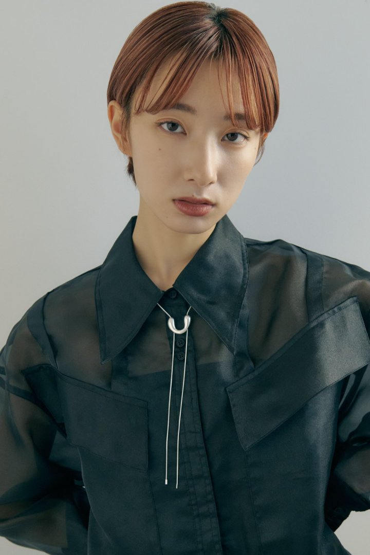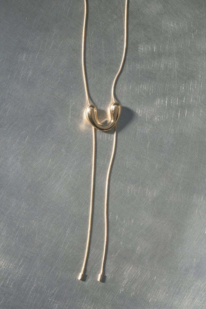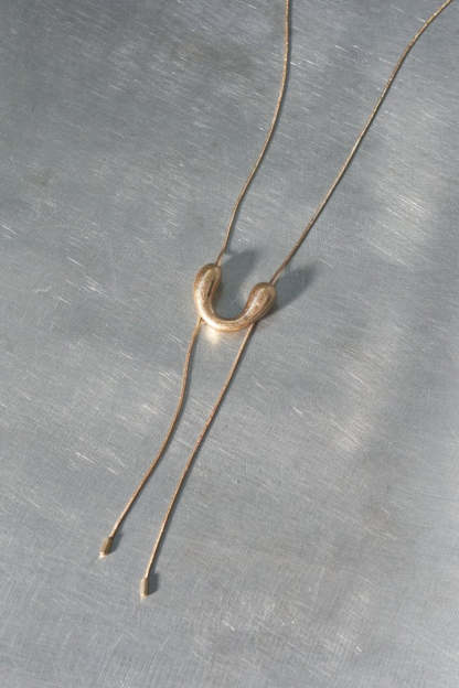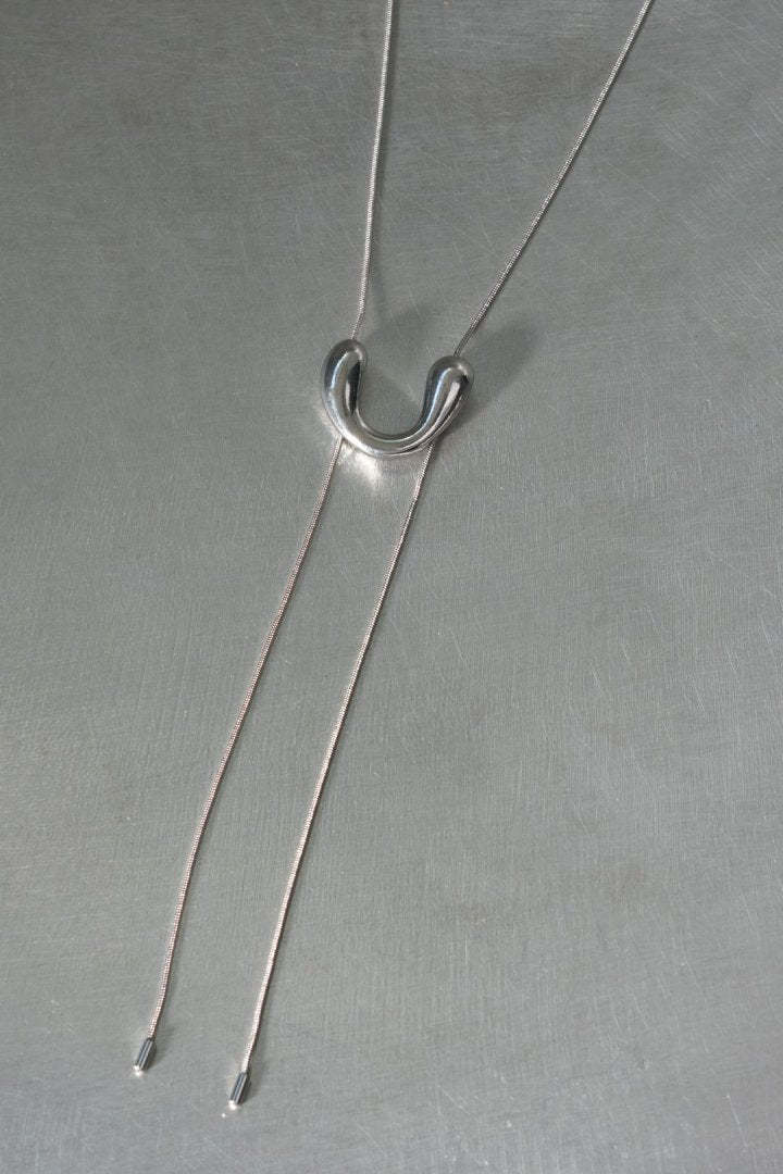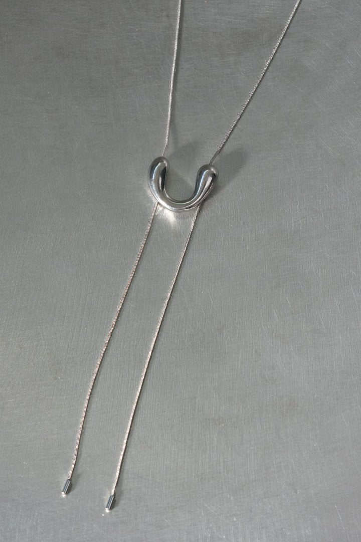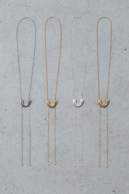 モチーフをスライドさせることでお好きな長さに調節できるので、ループタイ調のY字シルエットはもちろん、ロングネックレスとしてもお使いいただけます。